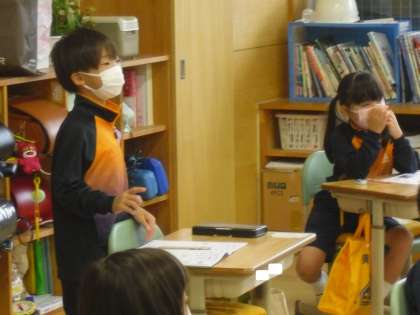 カタカナの学習をしています。字を見て気づいたことを発表したり、指書きで書き順を確認したりした後、姿勢を正してノートに丁寧に書いていました。
