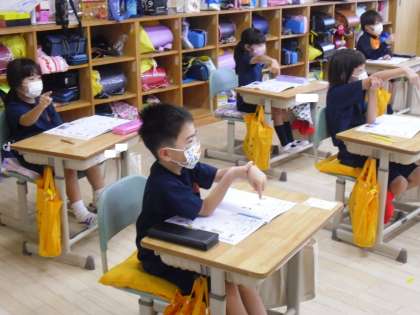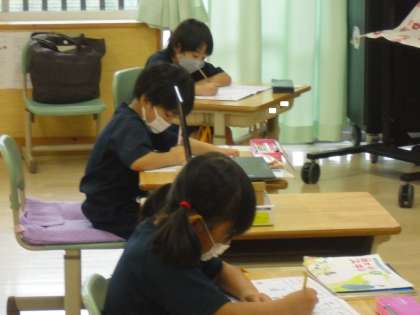 カタカナの学習をしています。字を見て気づいたことを発表したり、指書きで書き順を確認したりした後、姿勢を正してノートに丁寧に書いていました。