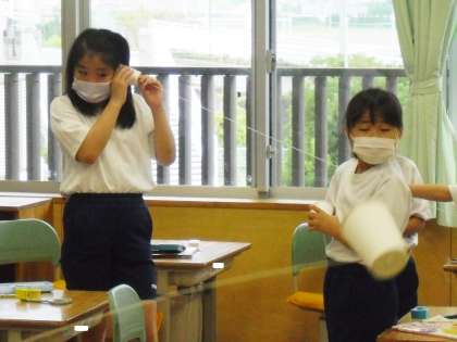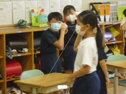 「糸電話」紙コップと糸を使って糸電話を作りました。友だちの声はよく聞こえるでしょうか。