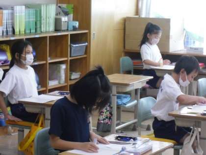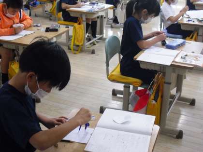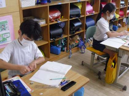 「円と球」コンパスを使って指示通りに書けた円のプリントをノートに貼りつけていました。