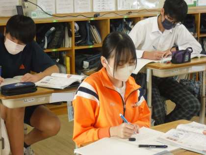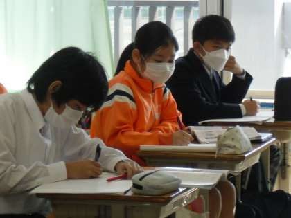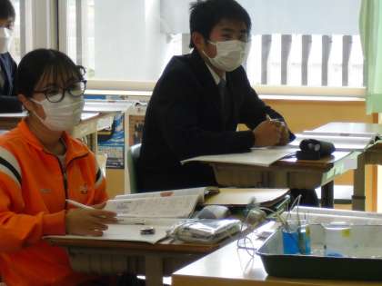 「ボルタ電池」と「ダニエル電池」について、仕組みを学習しノートにまとめています。前の机の上では、演示の電池によりモーターが回っています。