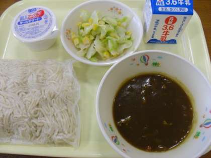 今日のメニューは、カレーソース(汁・めん)、コールスローサラダ、チーズデザート、牛乳です。
