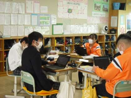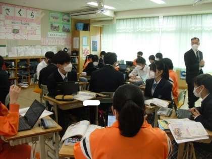裁判所について調べていました。民事裁判と刑事裁判の違い、三審制がとられている理由などについて調べました。自分が調べてわかったことをグループのメンバーに説明しているところです。
