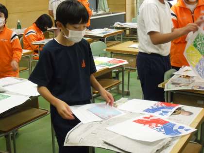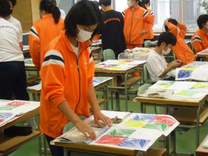 「版画」印刷を始めました。カラフルな作品ができあがっています。