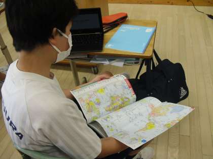 7年生は、「世界の姿」の学習です。今日は、自分が興味を持った世界の国や日本国内の都道府県から選んで、その国や都道府県についてのクイズをスライドで作成していました。スライドで作成するために、地図やインターネットを用いて、その国や都道府県の特徴などを調べていました。スライドの完成が楽しみです。