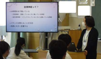 本日の9Aの学活では、青少年教育センターから二人の先生がお見えになり、ストレスマネジメントについて学びました。自律神経が乱れた状態はどのようになるかを学んだ後、自律神経を整える方法を教えていただき、実際に行ってみました。生徒からは、最後に「今後はストレスと上手につきあっていきたい。」と感想が出されました。