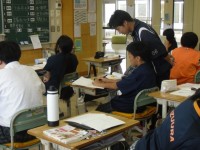 7Aの英語では、教師の発音を聞いて、単語の空欄にアルファベットを入れる問題に挑戦...