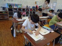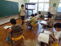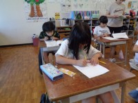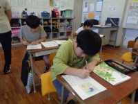 教科書にあるお話が途中で終わっているので、挿絵を見ながらお話の続きを考えています。