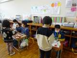 お買い物ゲームをしました。「How much?」「5 dollers!」などと、英語で楽しそうに会話をしていました。