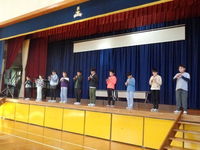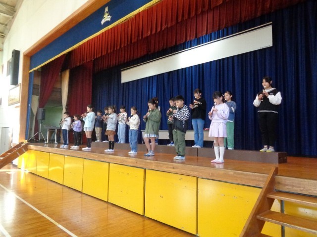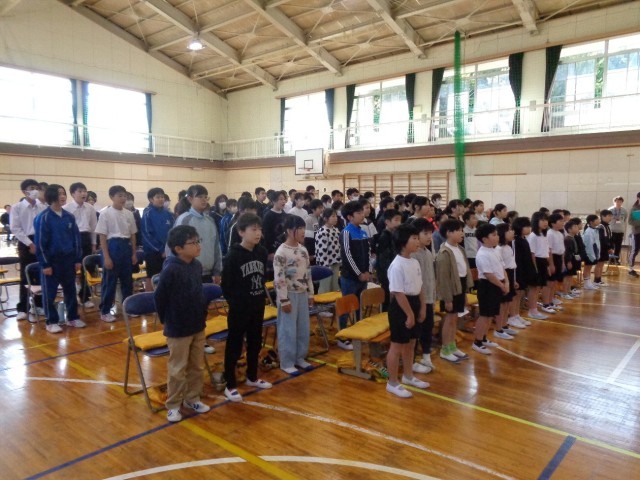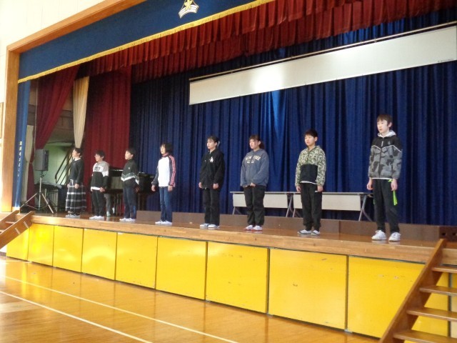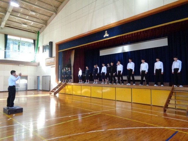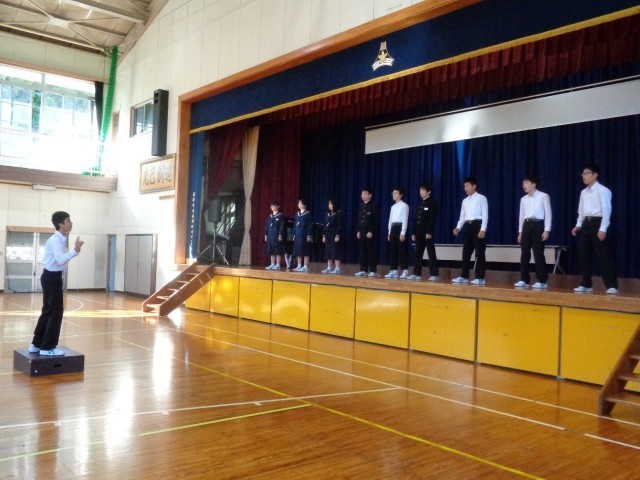 全校児童・生徒が集まり、金曜日に予定されている音楽発表会のリハーサルを行いました。