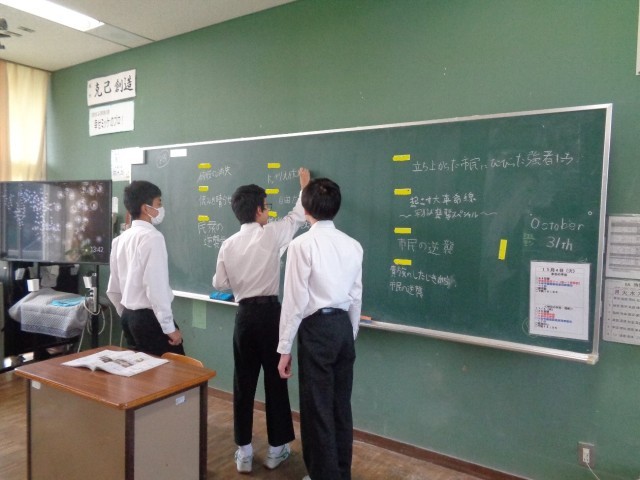フランス革命を一言で表すという課題で、それぞれが考えたコピーを黒板に書いていきました。