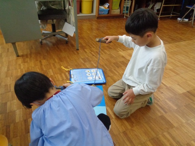 校内を探検して回ったり、1年生が準備したどんぐりや松ぼっくりの遊びランドで楽しんだり、体育館で一緒に遊んだりしました。