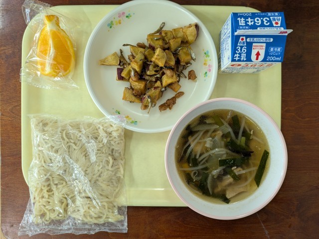 本日の給食は、中華めん、牛乳、塩ラーメンの汁、さつまいもと小魚の揚げ煮です。