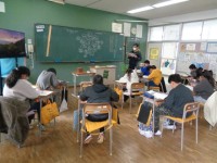 打楽器のパートを手拍子で確認した後、音楽室にある打楽器で演奏しました。