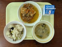本日の給食は、ごはん、牛乳、焼き塩サバ、ひじきと大豆の炒め煮、麩とえのきたけのみそ汁です。