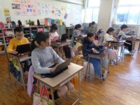 クリスマスツリーの飾りに使った形と色を、友達に説明しています。