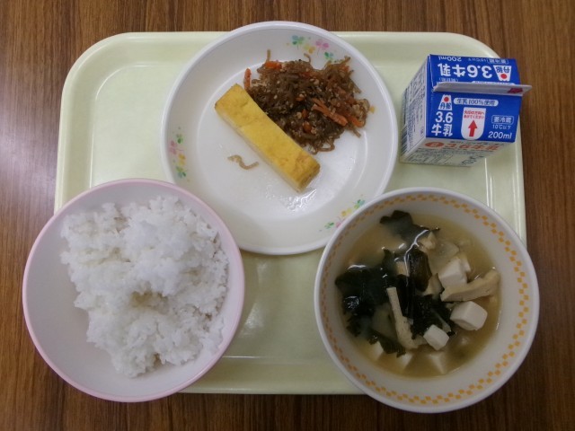 本日の給食は、ごはん、牛乳、厚焼きたまご、糸こんにゃくのきんぴら、里いもとわかめのみそ汁です。