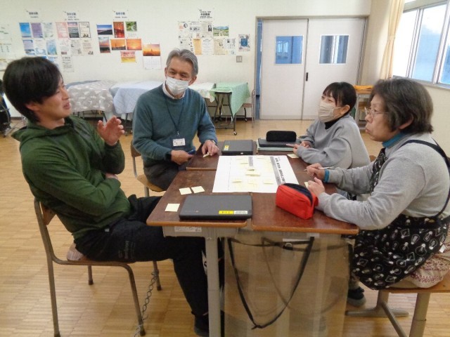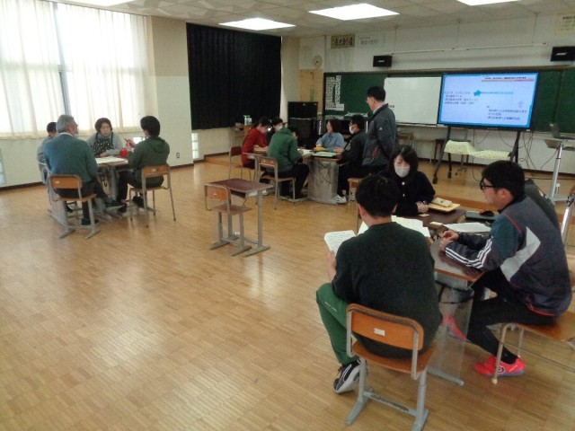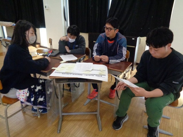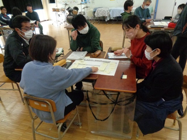 子供たちの姿を思い浮かべながら1年間の研修を振り返り、小グループに分かれて成果と課題について話し合いました。