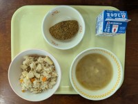 本日の給食は、ドリア、牛乳、カツオ入り野菜ソテー、フルーツポンチです。