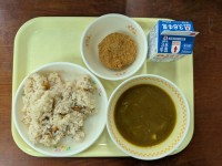 今日の給食は、カレーピラフ、牛乳、大豆とウインナーのトマト煮、キャベツときゅうりのサラダです。