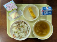 今日の給食は、ご飯、牛乳、焼き塩鮭、生揚げと大中寺いもの煮物、沼津茶です。