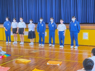 体育館で、大志部集会が行われています。部活動毎に一人一人が抱負を述べました。