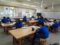 ミシンの学習をしています。ミシンの基本的な操作の仕方を確認するとともに、調子よく縫えないときの原因を考えています。