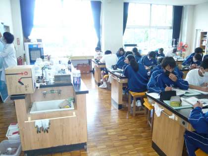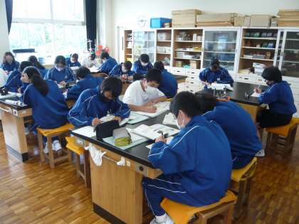 理科の授業では、これから実験を行います。実験の目的をワークシートに書き込み、どのような手順で進めるか確認しています。
