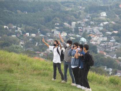 東伊豆に到着すると、大室山に登りました。クラスで記念撮影です。山の上はとても気持ちよさそうです。