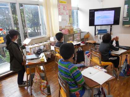 家庭での月動きの観察を画面表示させて発表をしました。何時に、どの方角に、どのくらいの高さで、どんな形で見えたかを伝え、月はどのように動いていくのかをみんなで考えています。