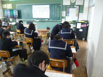 漢文を書き下し文に書き直しています。歴史的仮名遣いをどのように言い換えたらいいか考え、読み方の順序にも気を付けて書き換えを行ってます。分からないところは教え合い、完成したら教科書で確認をしています。