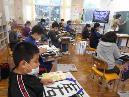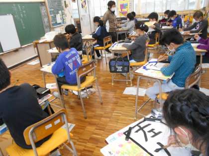 課題文字「左右」の特徴を捉え、練習をしました。筆順も確認しながら一画一画丁寧に書いていました。