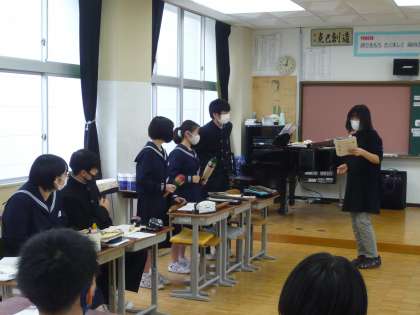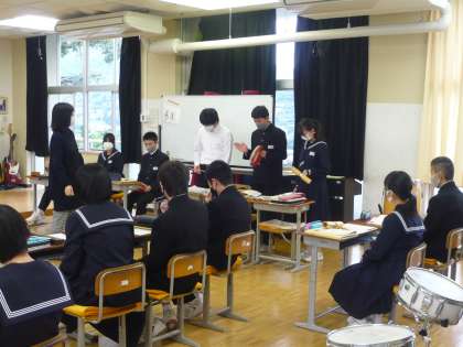 3人組に分かれて、リズムアンサンブルを行います。一人一人が楽器を選び、その行い方を理解していました。グループでどのような演奏にするかイメージを膨らませてほしいと思います。