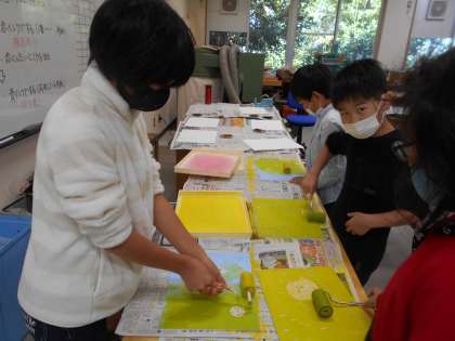 多色刷り版画を作成中です。第一段階の彫りが終わると黄色の画版をつくりました。