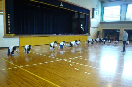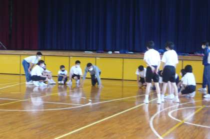 外は雨が降っているので、体育館で陸上競技のクラウチングスタートの練習です。小学生まではスタンディングスタートを行ってきましたが、より専門的な技能を学んでいます。クラウチングスタートの姿勢や動き、ポイントを一つ一つ確認しています。