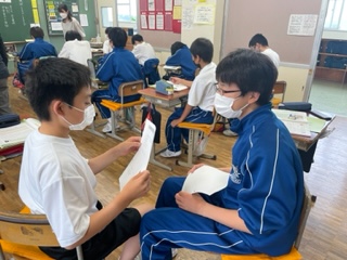 「挨拶しますかしませんか」の教材を使って、挨拶をしない暮らしというものはどんなものになるのか考え合いました。挨拶の意義について自分の経験をした具体的な場面を進んで話し、互いに聞き合い理解を深めることができました。「相手の気持ちがわかる」「お互いがよい気持ちになる」「日頃から挨拶していれば何かあったとき助けることができる」「地域の人も知ることができる」等、挨拶の力を再発見できた授業です。