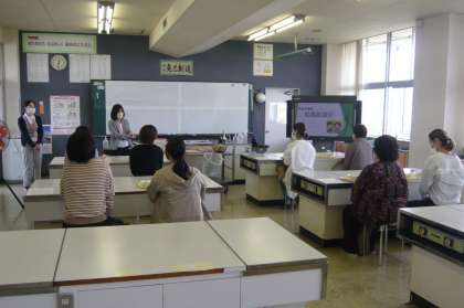 1年生の配膳や食べ始めた様子を見学した後、保護者の方も家庭科室で試食です。