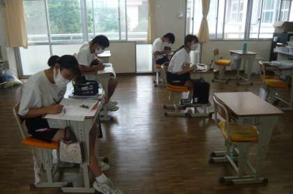 もうすぐに迫った学力調査に向けて、問題をたくさん解いて力を付けています。連立方程式など、力を付けたい領域の問題に集中的に取り組んでいます。問題を解いたら答え合わせです。どのように解いたらよいか、じっくりと考えています。