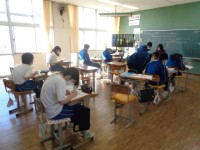 大型画面から流れる教科書の本文の音声を聞いて、質問の内容が合っているか間違えているか考えています。根拠となる文を仲間と見つけて判断しています。