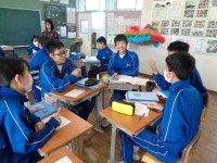 「○○をしてほしい。」という表現を完成させようとプリントに書き込みを行っています。英単語の語順に気を付けながら文章を整えています。