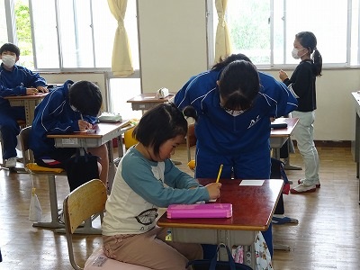 9年生を中心に、中学生が低学年のお世話をしていました。ひらがなを学習中の1年生に代わって、どんなめあてにするか聞きながらカードに書いている姿も見られました。