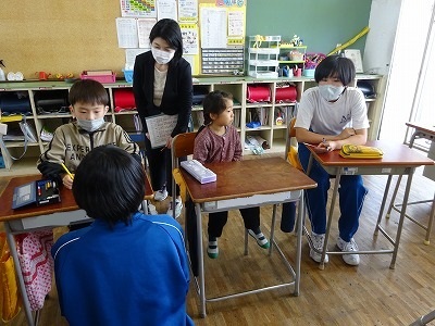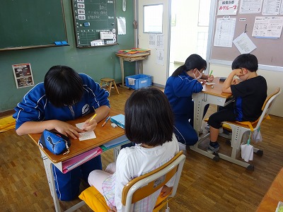 9年生を中心に、中学生が低学年のお世話をしていました。ひらがなを学習中の1年生に代わって、どんなめあてにするか聞きながらカードに書いている姿も見られました。