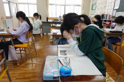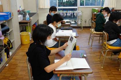 「手で食べる はしで食べる」の先生の音読を、教科書を目で追いながら聞いています。