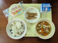 今日の給食は、ご飯、牛乳、もやしと挽肉の味噌炒め、スーラータンです。