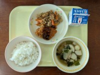 本日の給食は、ソフトめん、牛乳、つけナポリタン、大豆と小魚のからあげです。
