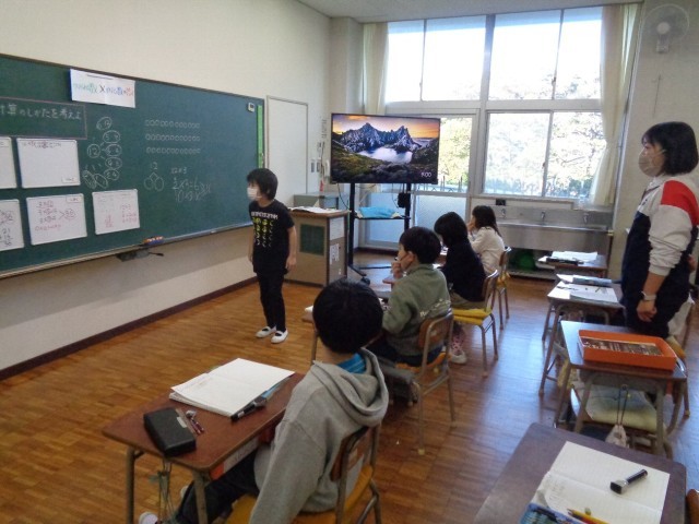 かけ算 九九 の学習です。モニターに順番に出される九九の問題にみんなで答えたり、お互いにカードを使って問題を出し合いました。バラバラに出される九九の問題に素早く、大きな声で答えています。