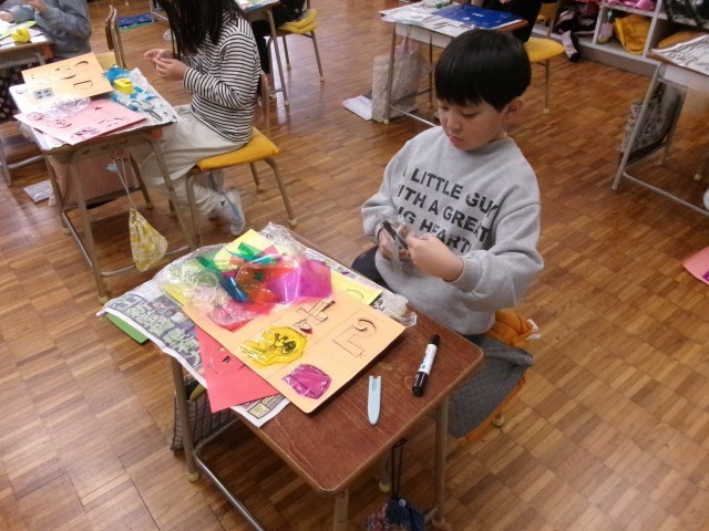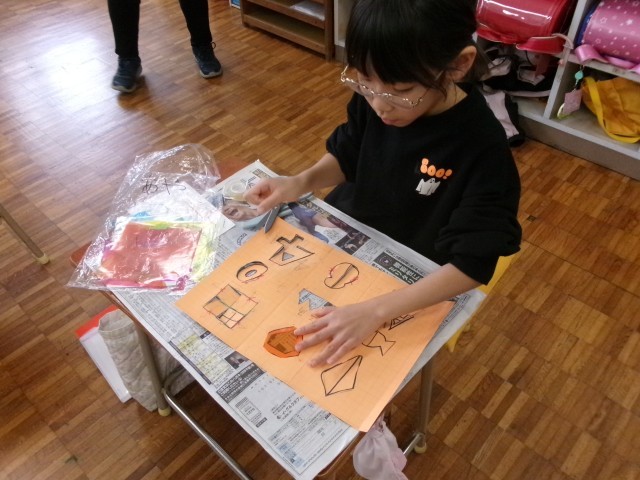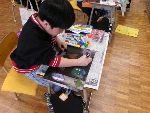 思い思いの形の窓にフィルムを貼ったり、ペンで装飾したりしています。みなさん、集中しています。