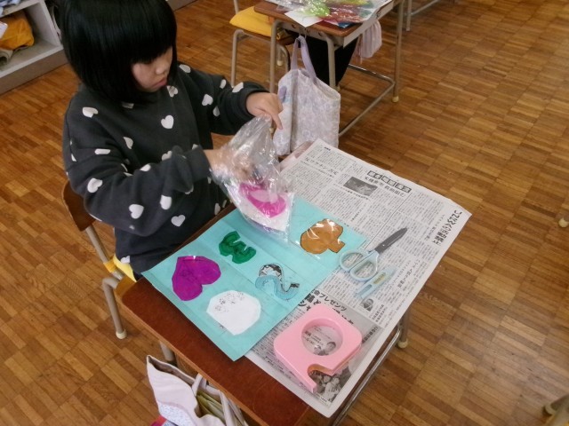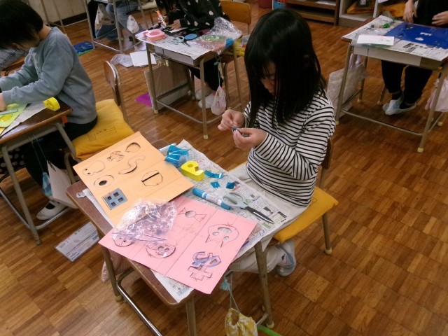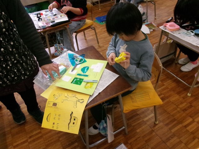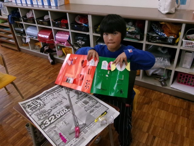 前回の授業で、厚紙をカッターで切って窓をつくりました。