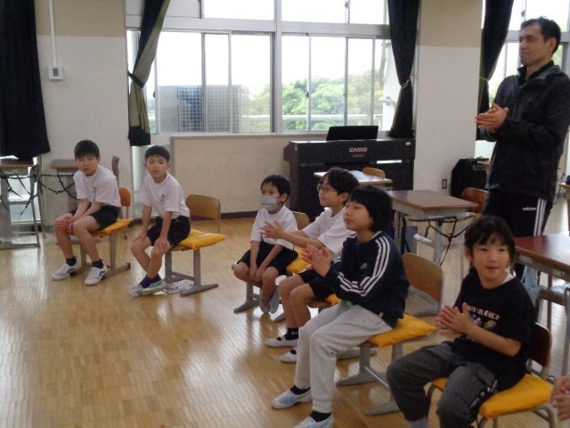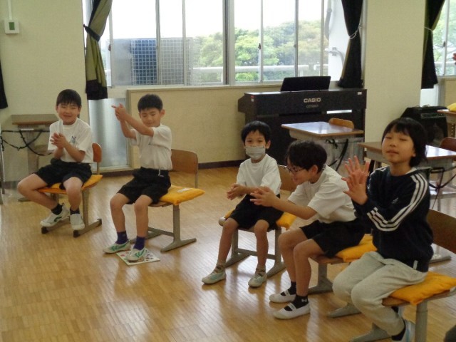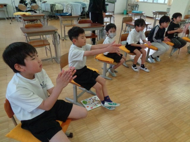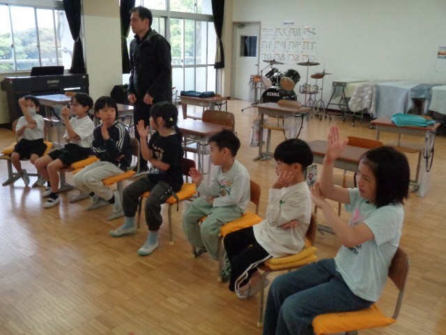 一緒に歌ったり、それぞれの学年で学習したことを発表したり、最後はリズム遊びや踊りで体を動かしたり、みんなとても楽しそうでした。