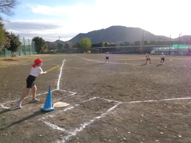 ボールをよく見てバットを振りますが、なかなか前に飛ばず、苦戦しています。